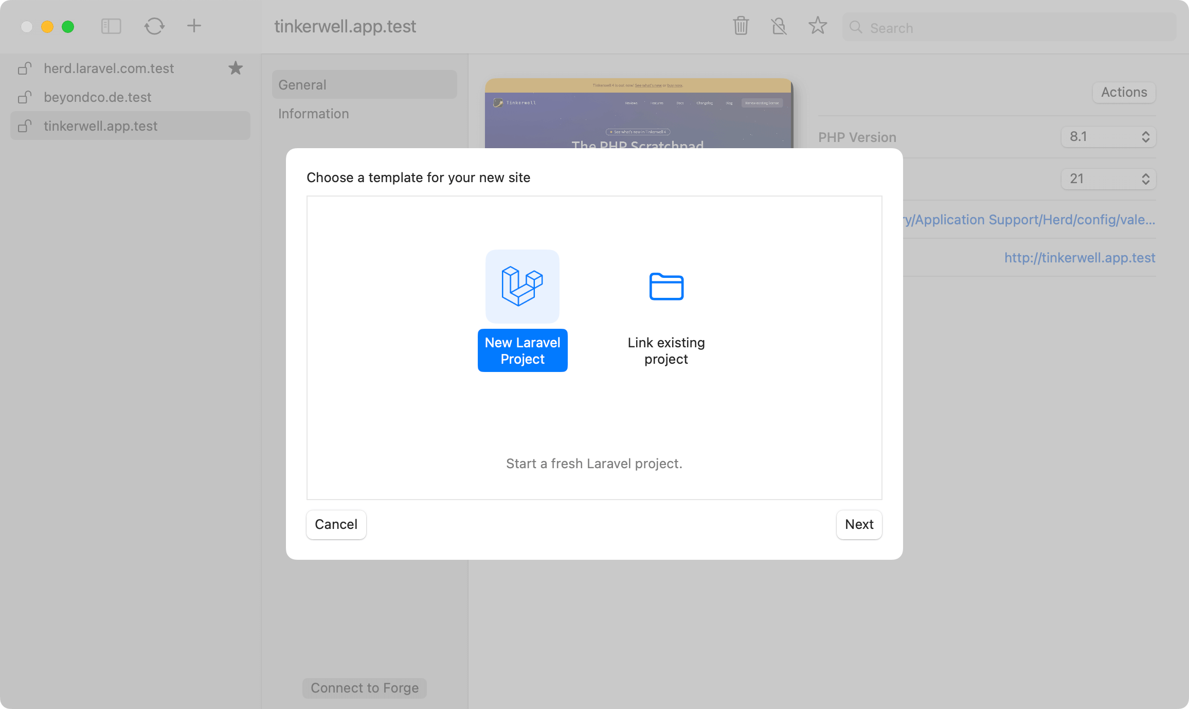 If you prefer creating and linking sites via a graphical user interface, you can use Herd's site wizard to create new Laravel applications or link existing projects.