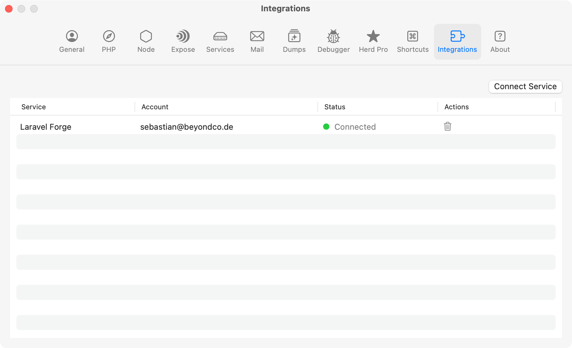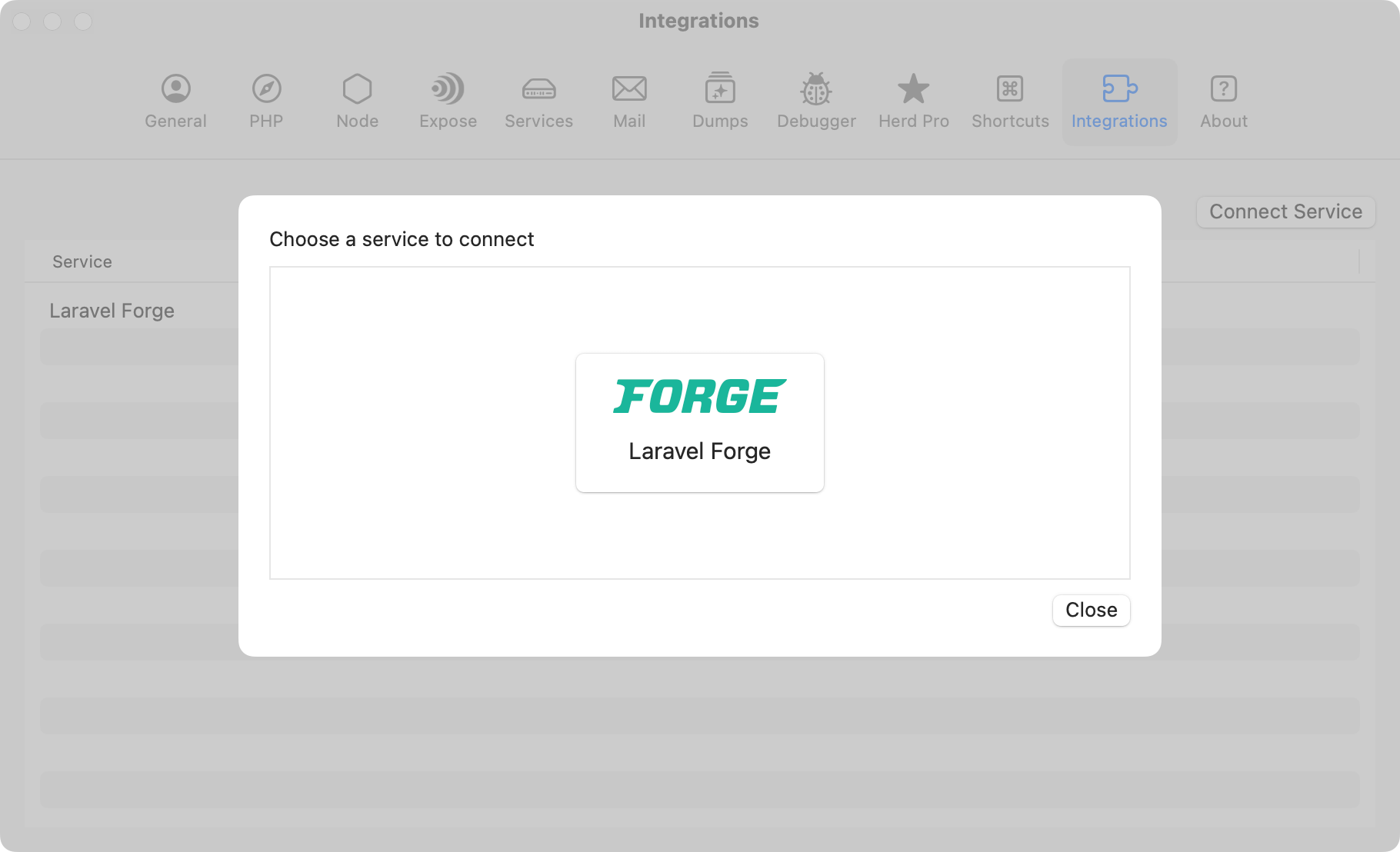 To use the Forge integration, you need to set up at least one Forge account in the Integrations tab of the settings. Select Connect Service and select Laravel Forge. Herd supports multiple Forge accounts in case you have separate accounts for your personal sites and sites that you manage at work.