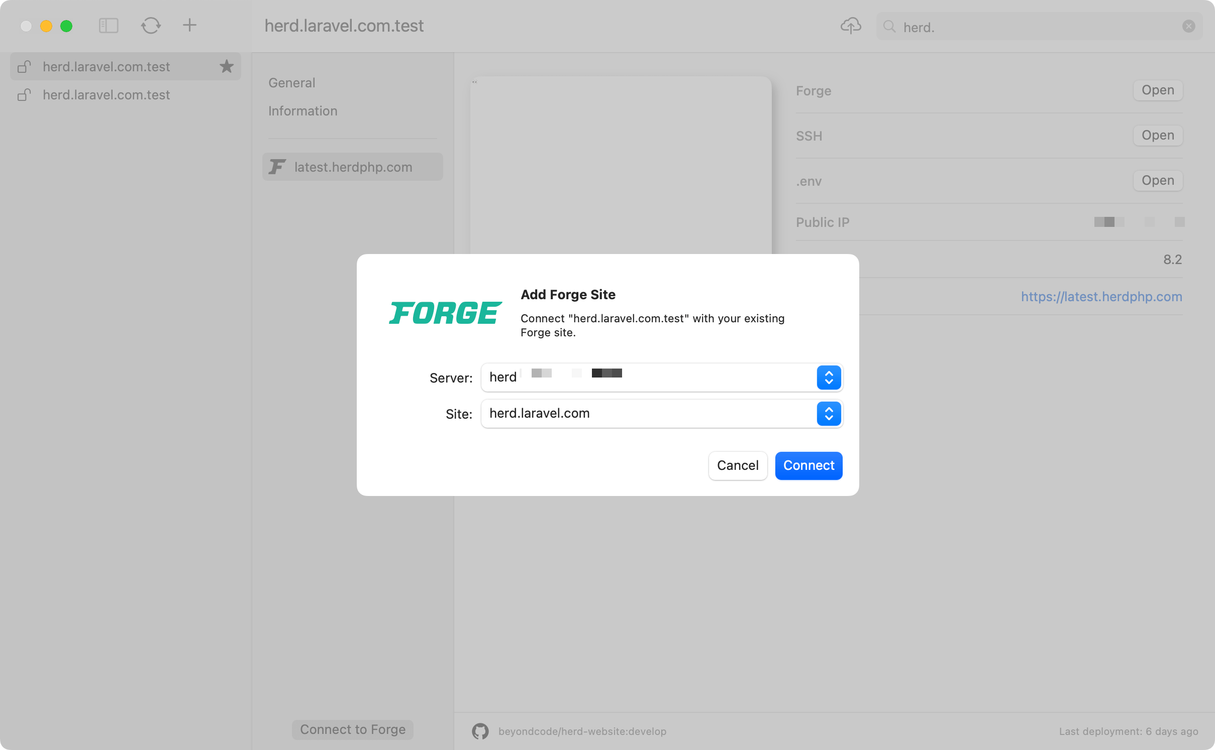 When the integration is set up, you can open the Sites panel, select a site and press the button to connect this site to one or more sites on Forge. This allows you to access development, staging and production environments directly from one Herd site.