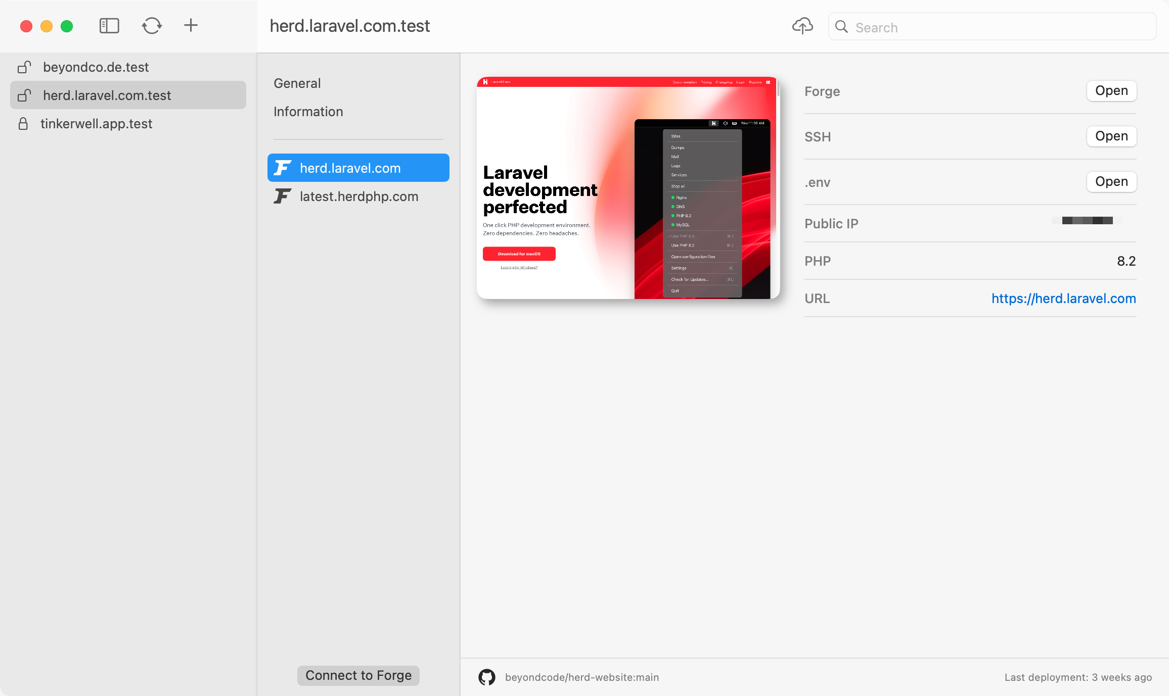 Herd has a seamless integration with Laravel Forge and allows you to interact and deploy your Herd site directly on Forge. After connecting your site, you are able to deploy the site, open an SSH connection, grab your environment variables or open the site within Forge with a single click.