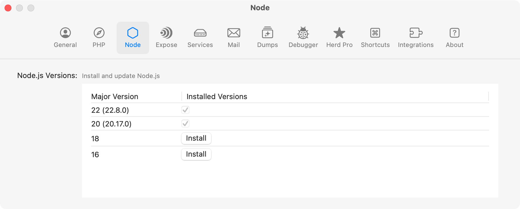 Herd ships with nvm, the Node version manager which allows the management of multiple Node.js versions on your machine. By default, Herd automatically installs the latest available version of Node.js for you.