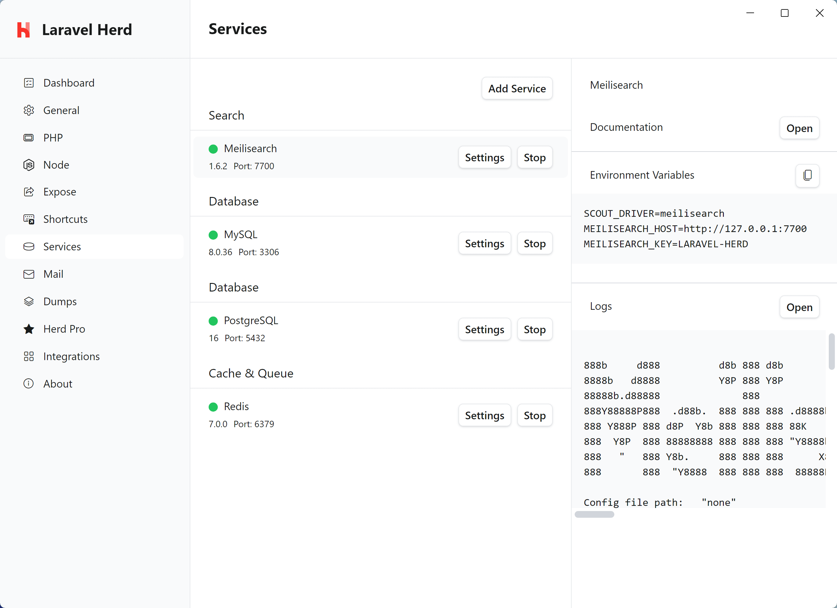 Like with all Herd services, you can configure the port as well as the service name of your Meilisearch instance and add the following environment variables to your .env file.